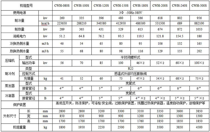 注:1.以上规格参数能力的测定工况:冷冻水入口温度12℃,出口温度7℃,冷却水入口温度30℃,出口温度35℃;